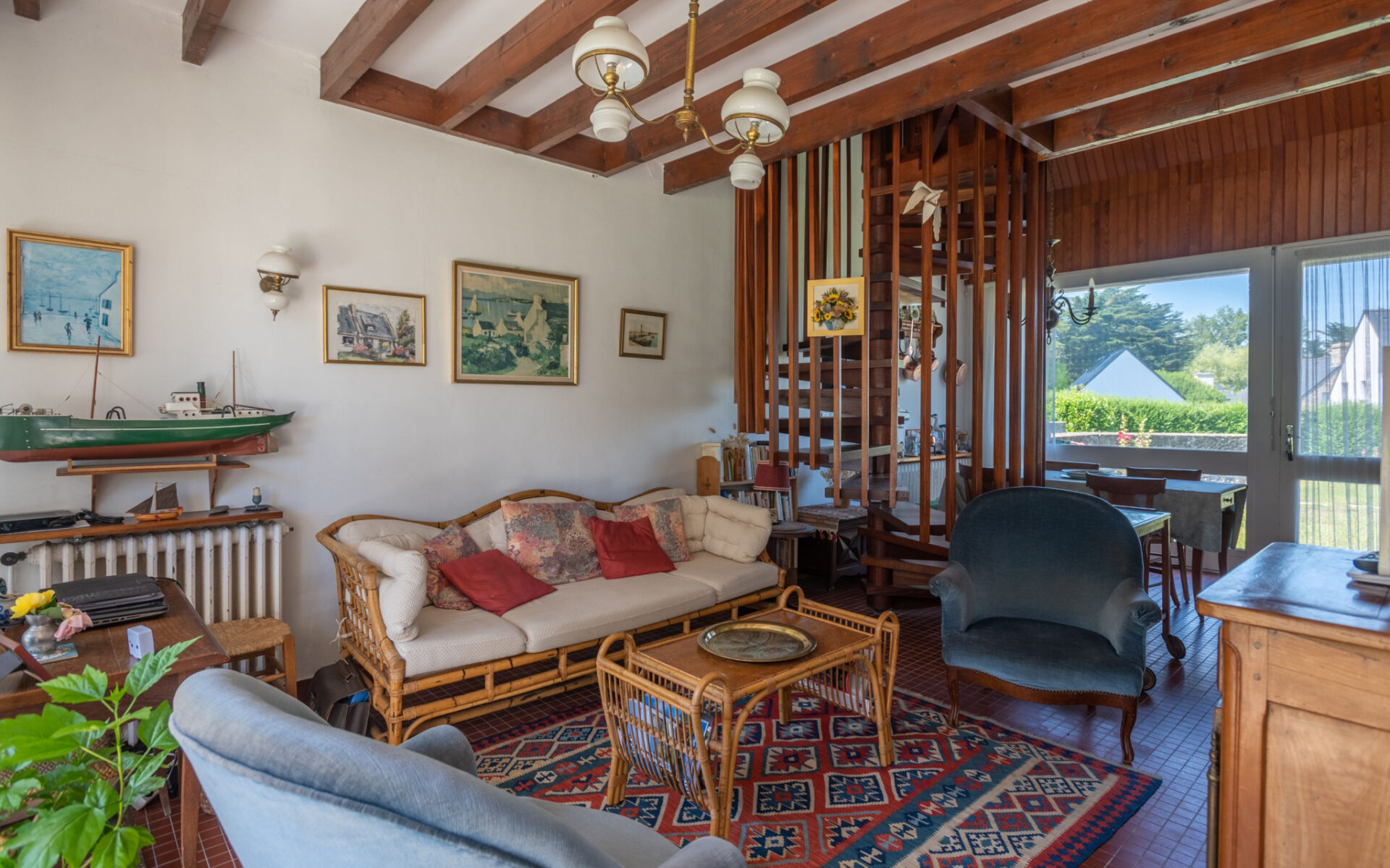 Dans une petite copropriété horizontale édifiée dans un grand environnement arboré, proximité immédiate de la plage accessible à pied, avec aperçu mer, une maison à usage d’habitation mitoyenne d’un côté ayant :