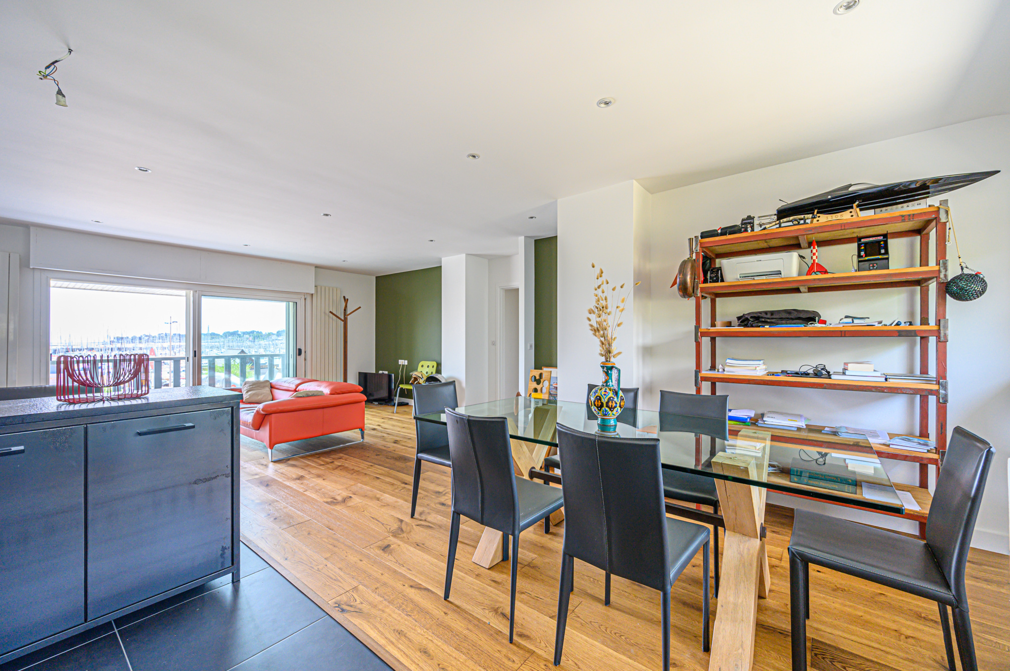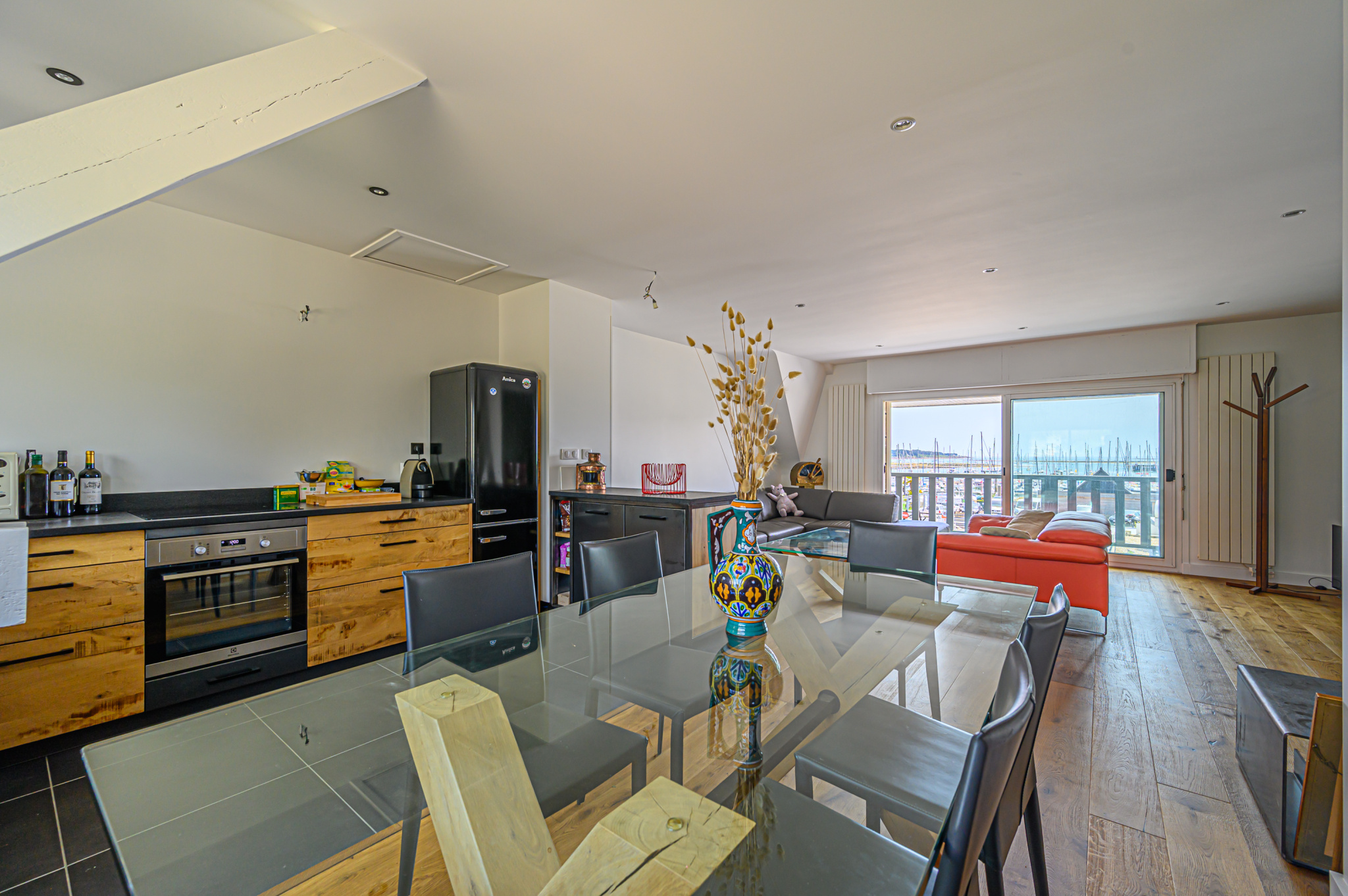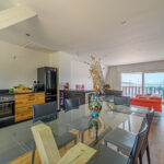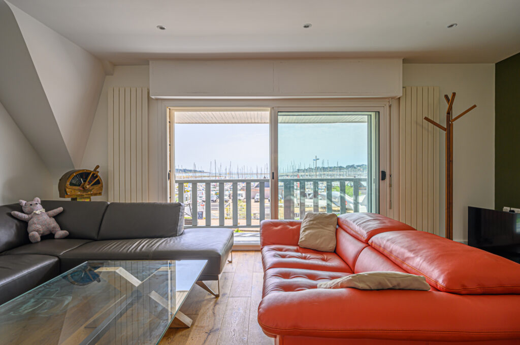 Un vaste séjour-salon de 44 m2 comprenant une grande cuisine américaine équipée et aménagée avec goût, une large baie et un balcon plein sud offrent une vue à 180 o sur le port