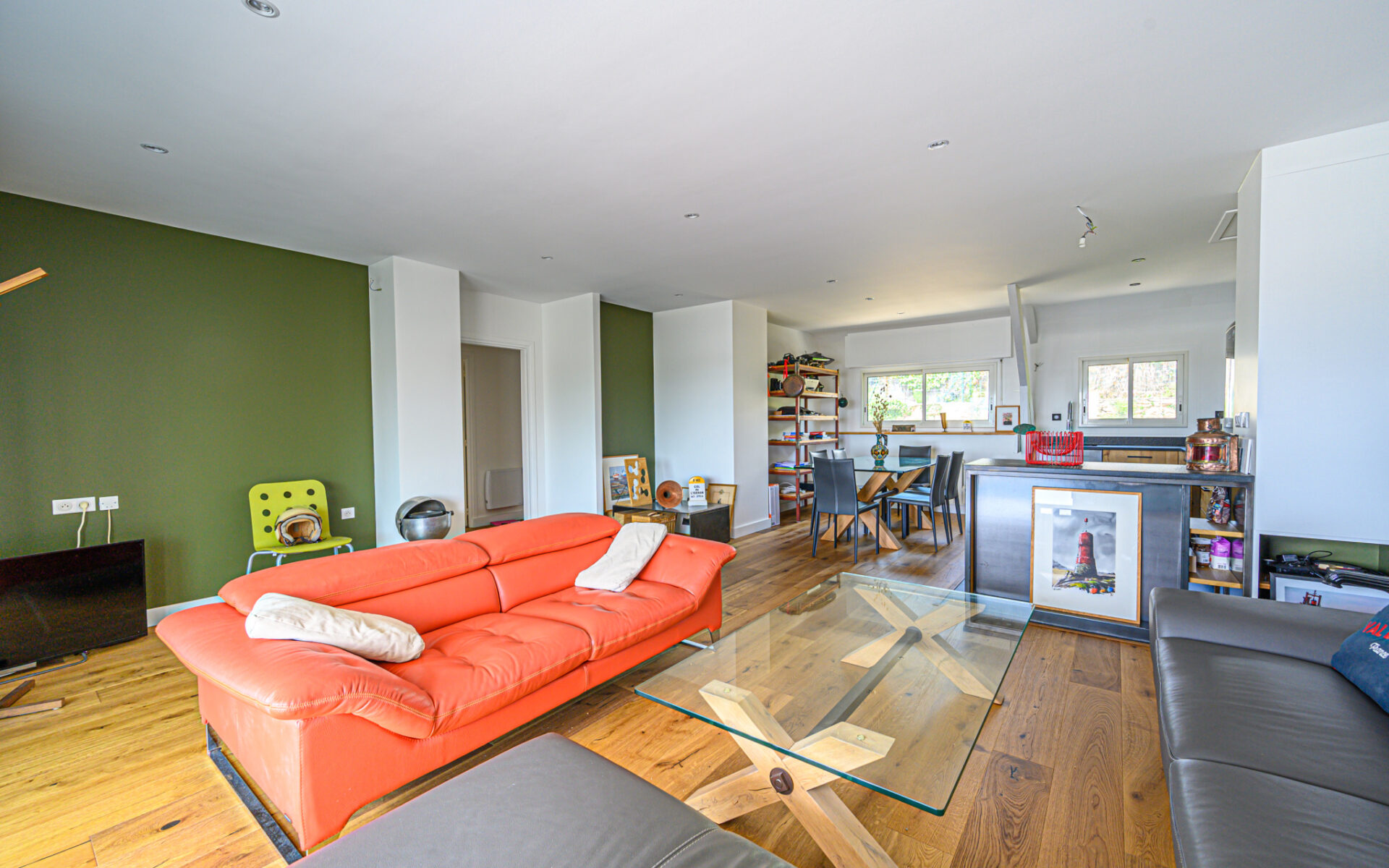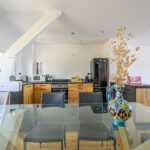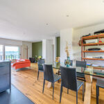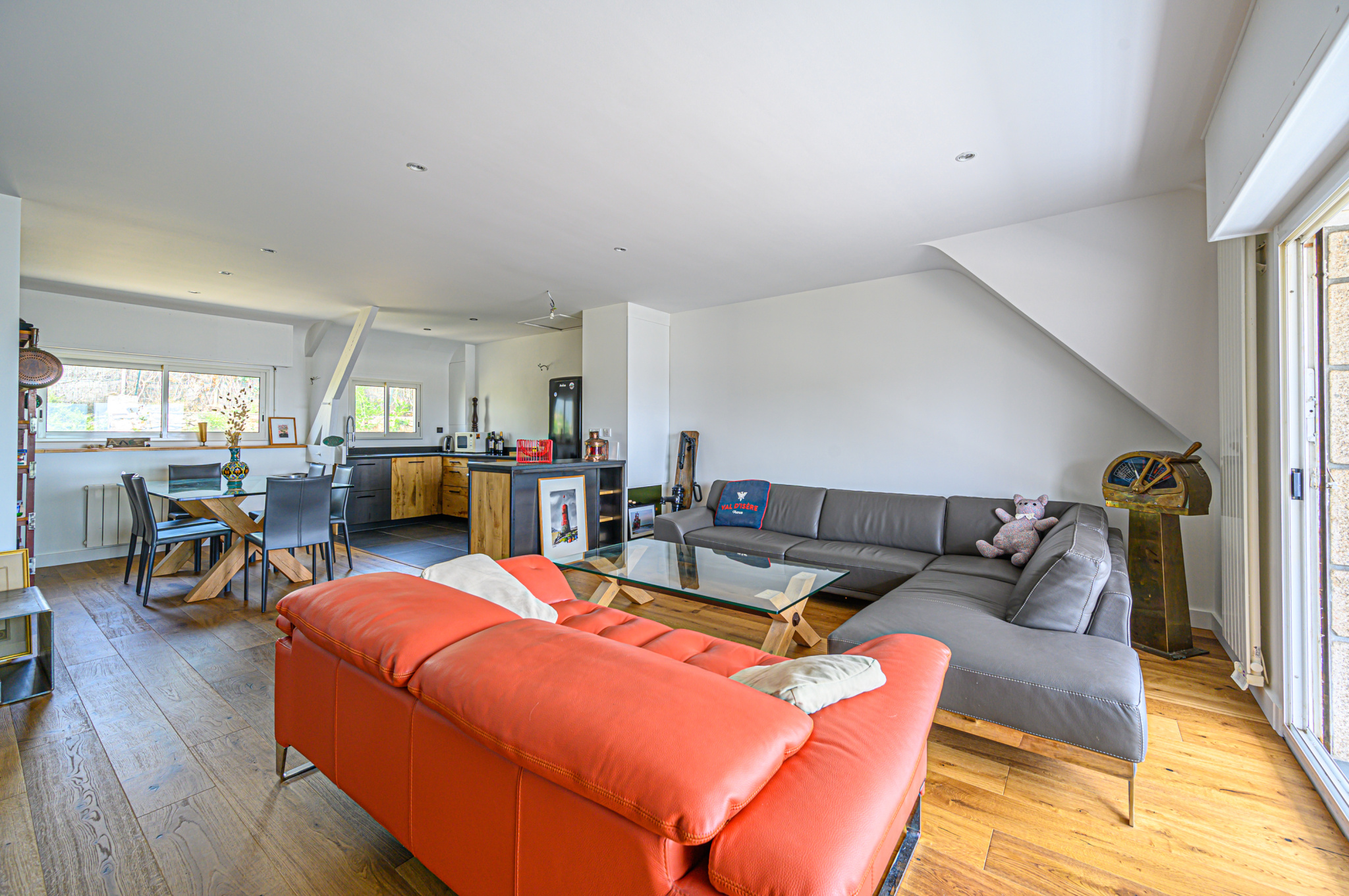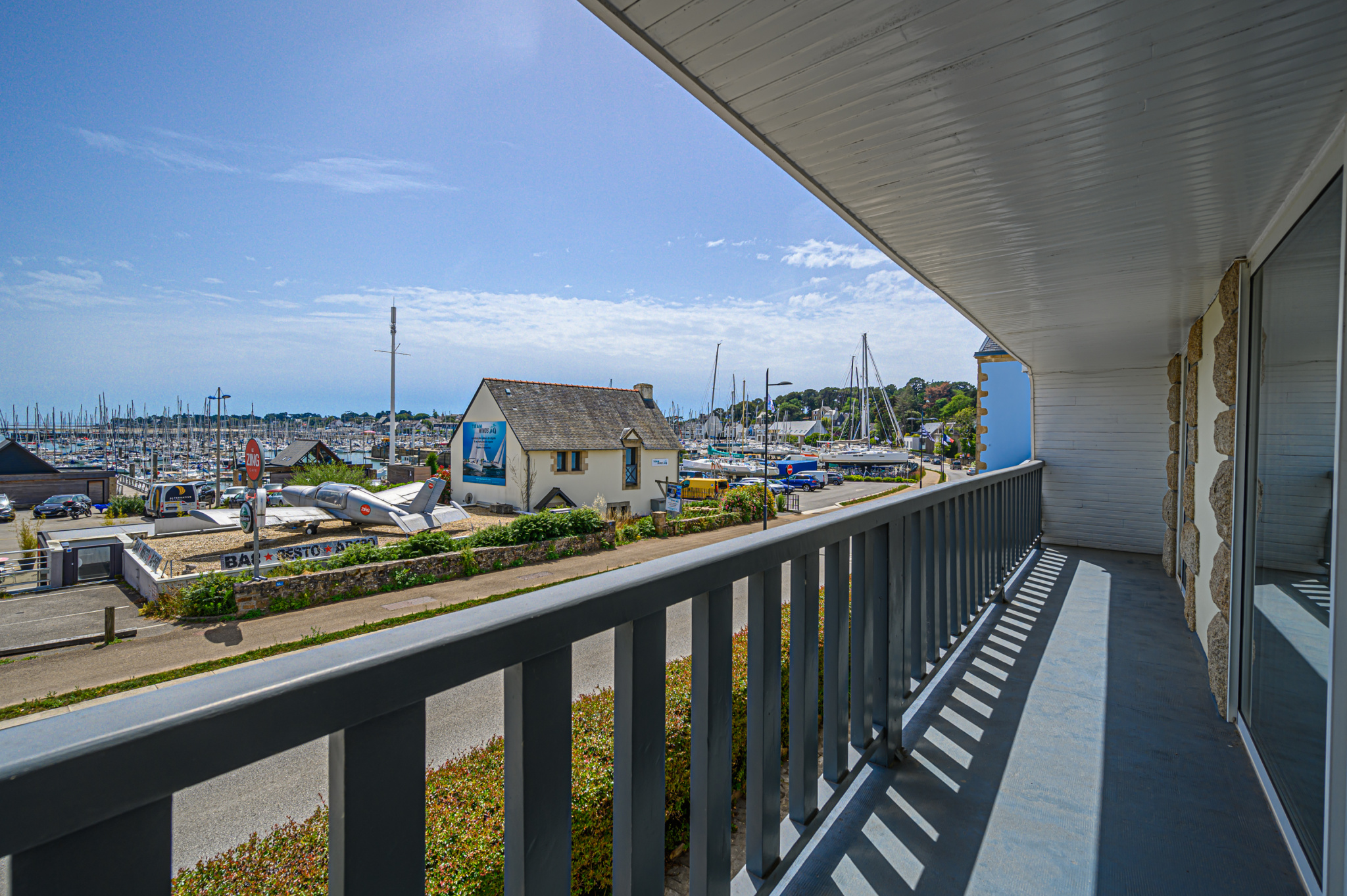 Un vaste séjour-salon de 44 m2 comprenant une grande cuisine américaine équipée et aménagée avec goût, une large baie et un balcon plein sud offrent une vue à 180 o sur le port