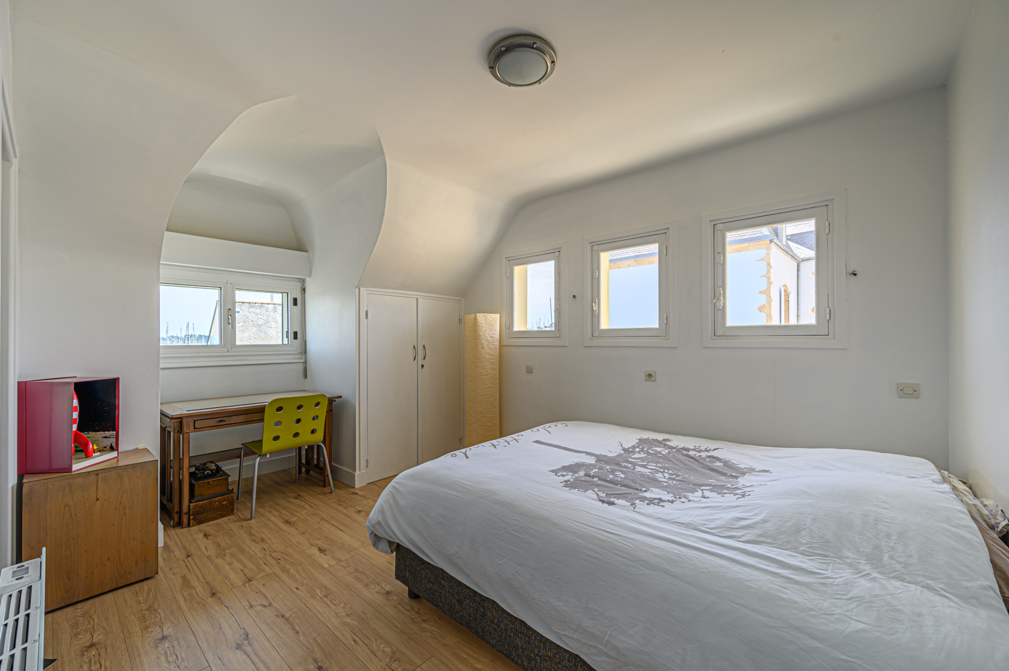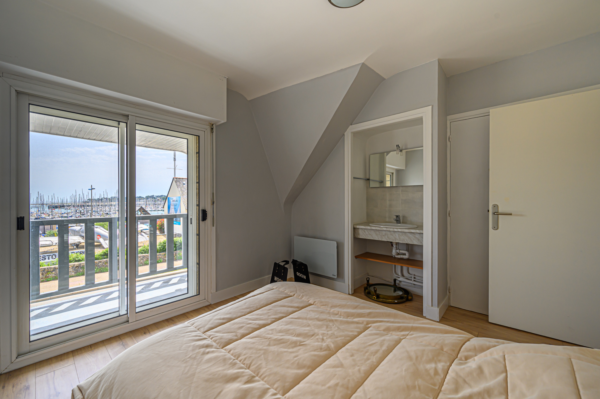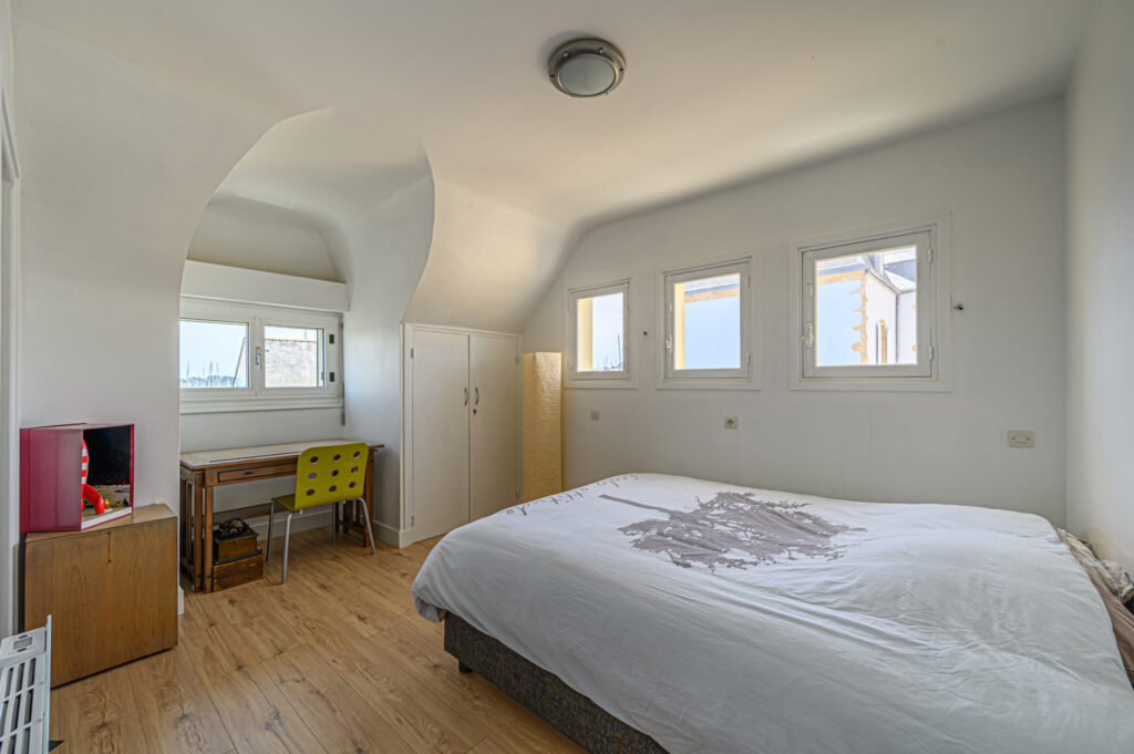A suivre, un dégagement dessert trois chambres dont deux ayant vue sur le port, une salle d’eau, wc séparés, buanderie.