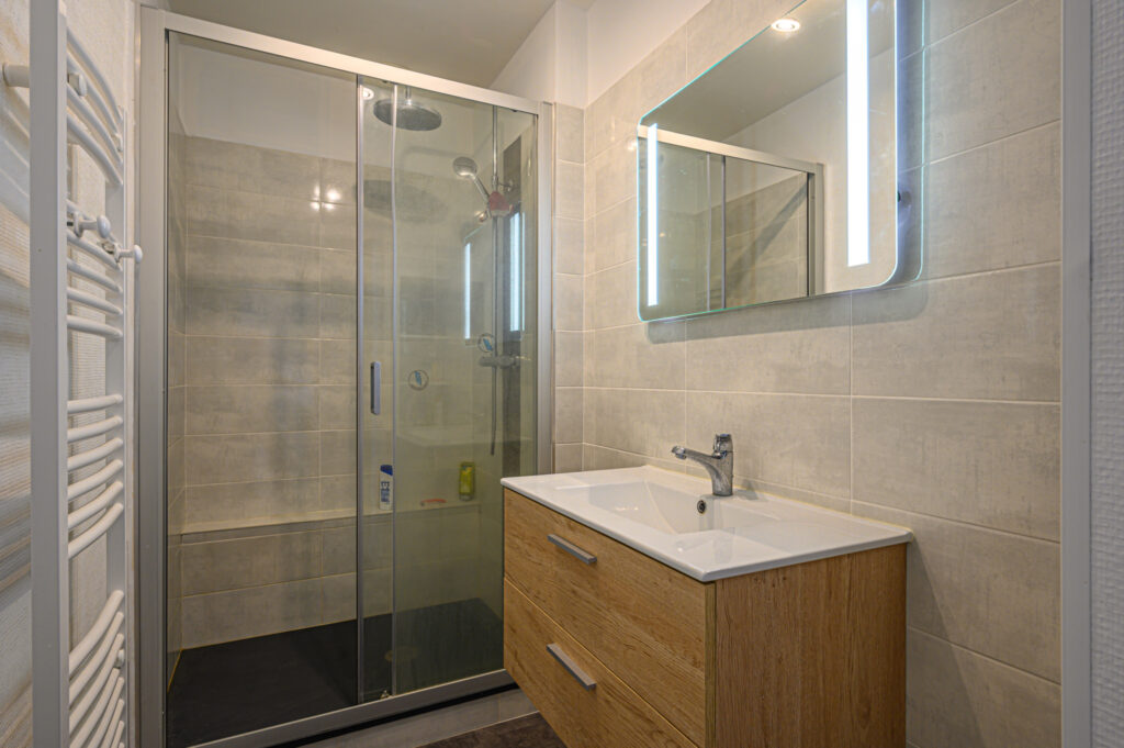 Vous bénéficieriez également d’un emplacement privatif vous permettant de garer deux véhicules et un espace extérieur aménageable en terrasse à l’arrière de la maison en rez-de-jardin.
