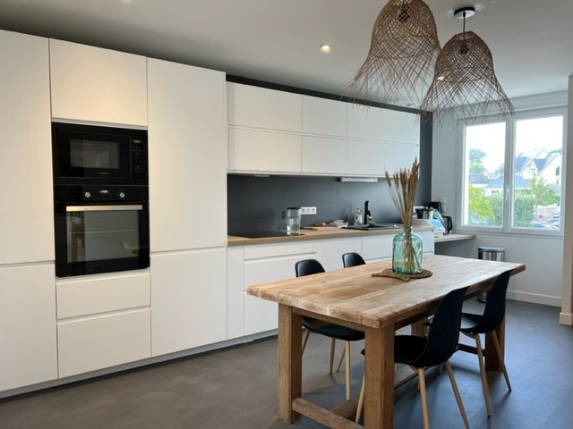 Au premier étage : une agréable pièce de vie très lumineuse et traversante, de 30 m2 environ, à suivre une cuisine entièrement équipée et aménagée de 20 m2 environ, un coin buanderie, wc séparé