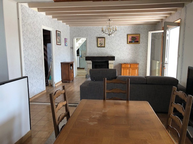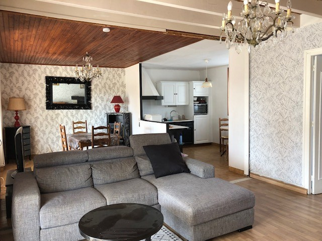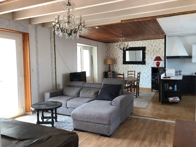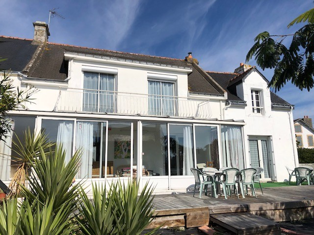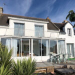 une entrée, salle d’eau avec wc, une grande pièce de vie de 40 m2 avec cuisine ouverte équipée et aménagée et une cheminée, une grande véranda plein Sud donnant sur le jardin et une jolie terrasse en bois de laquelle vous bénéficierez d’une belle vue mer.