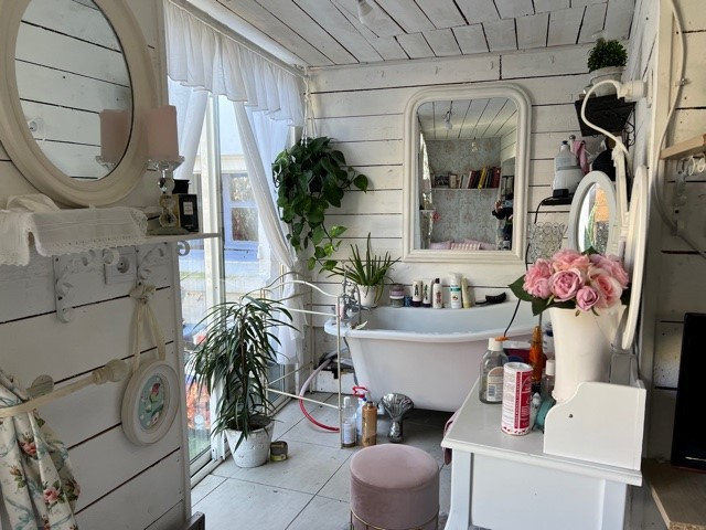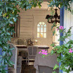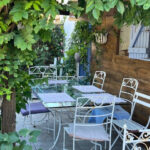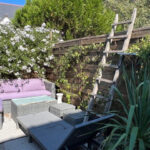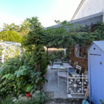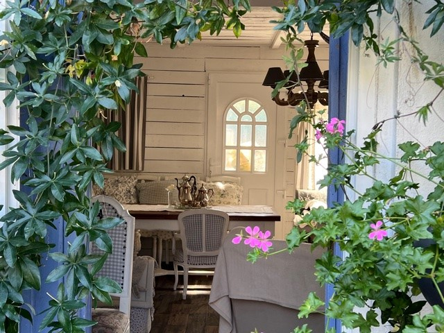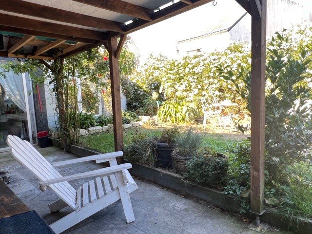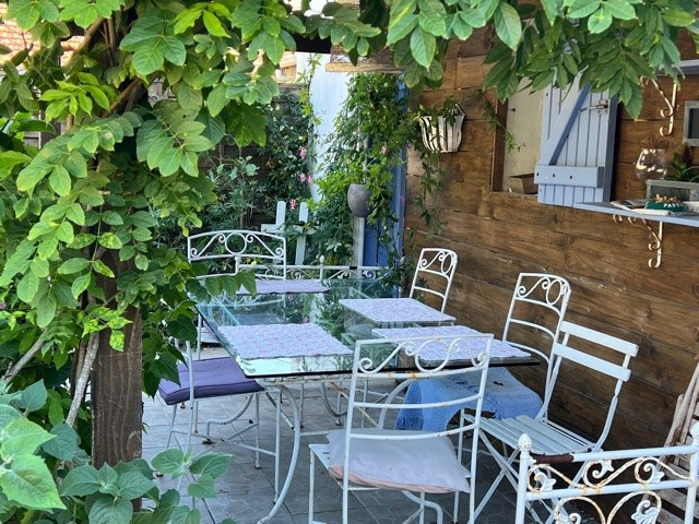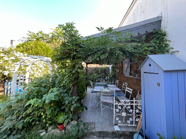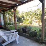 Agréable Terrasse ombragée dans le jardin et petite remise.
