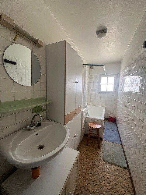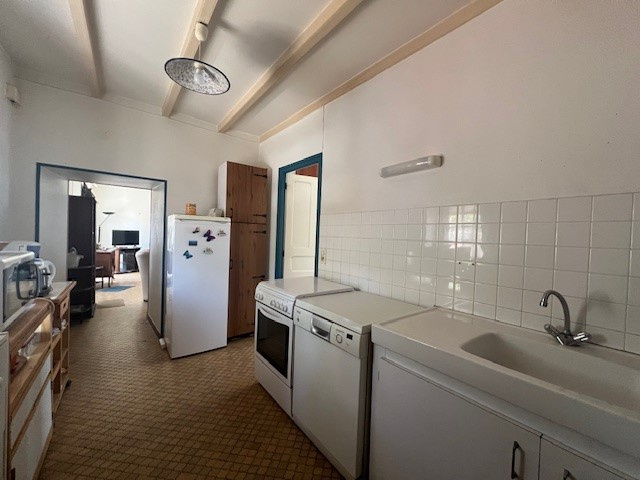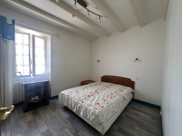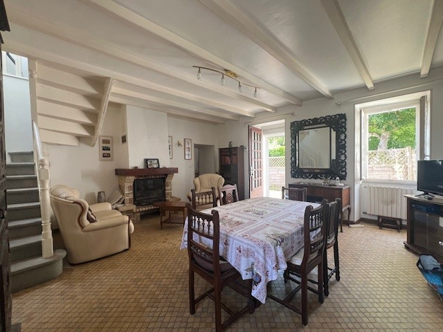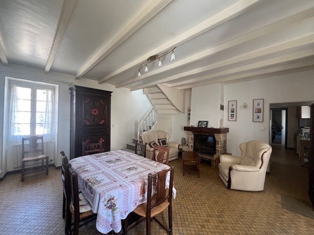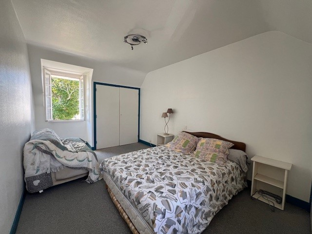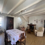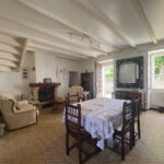 Cette maison est composée au rez-de-chaussée d’un séjour-salon avec cheminée, cuisine séparée, une chambre, wc, salle de bains et un garage attenant avec grenier au-dessus